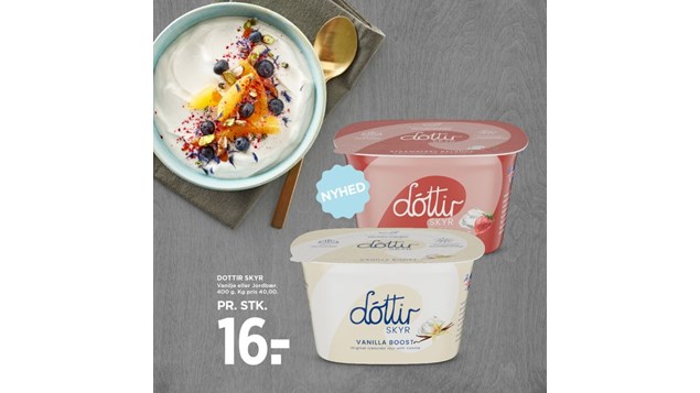 Som noget helt nyt finder du nu dóttir skyr i køledisken, og i denne uge kan du få den til 16 kr. pr. stk. Prøv varianterne Vanilla Boost, Strawberry Balance, Blueberry Focus eller Natural Soothing. Mums!
