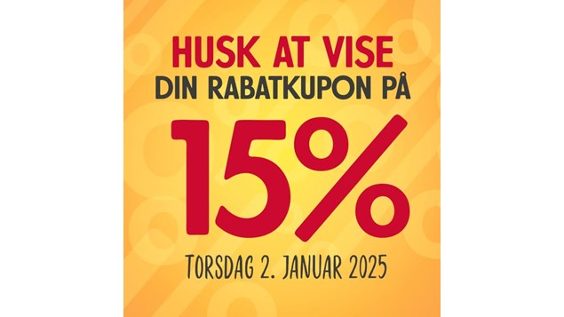 Indløs rabatten: Vis din kupon ved kassen d. 2. januar og få 15 % rabat på dit køb!