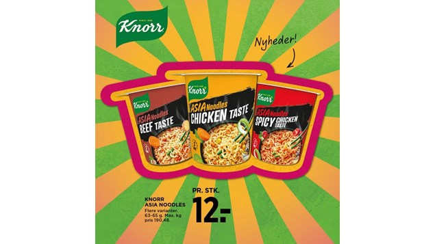 Meny Klarup introducerer de nye Knorr Snack Pot Asia Noodles i varianterne Chicken, Spicy Chicken og Beef. De er hurtige at tilberede og fri for konserveringsmidler. Disse kan fås til 12 kr. indtil 3. april 2025. Læs det oprindelige opslag for flere detaljer.